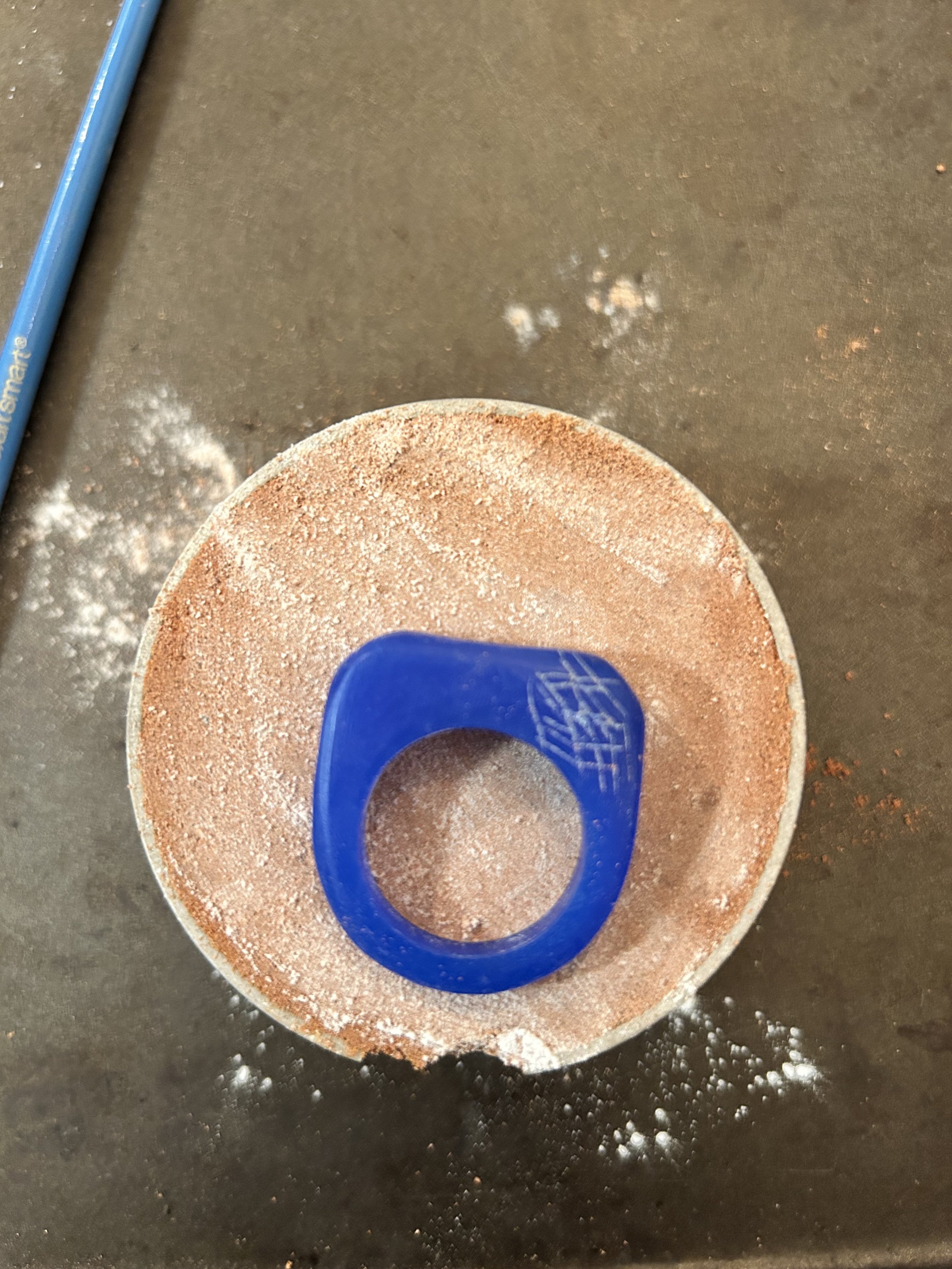 A blue plastic ring inside a sand-filled mold, surrounded by talc. This is one of the first stages of sand casting.
