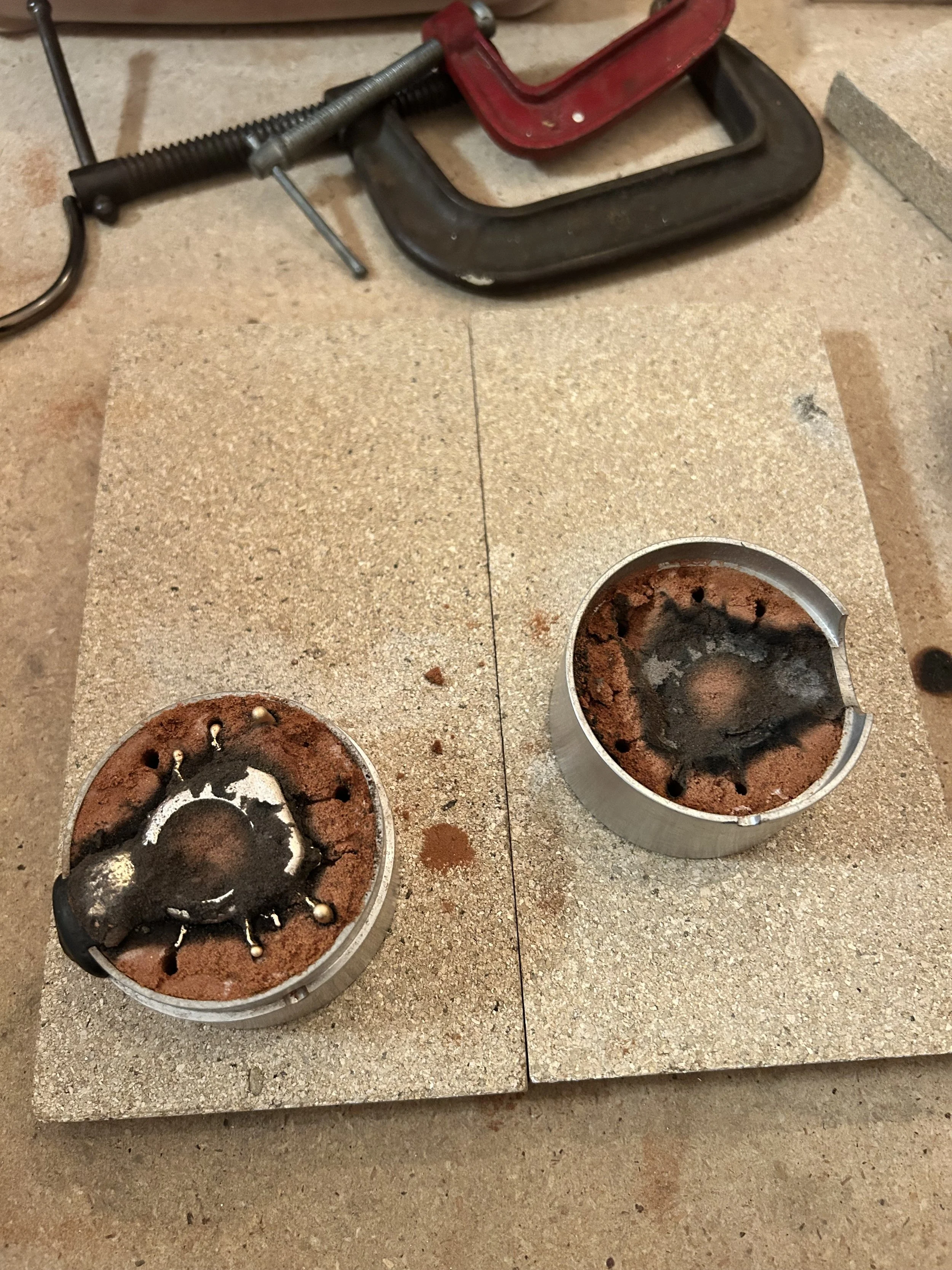 A metal ring with burnt residue on top, placed on a work surface, with clamps and tools nearby. This is one of the last steps of sand casting.