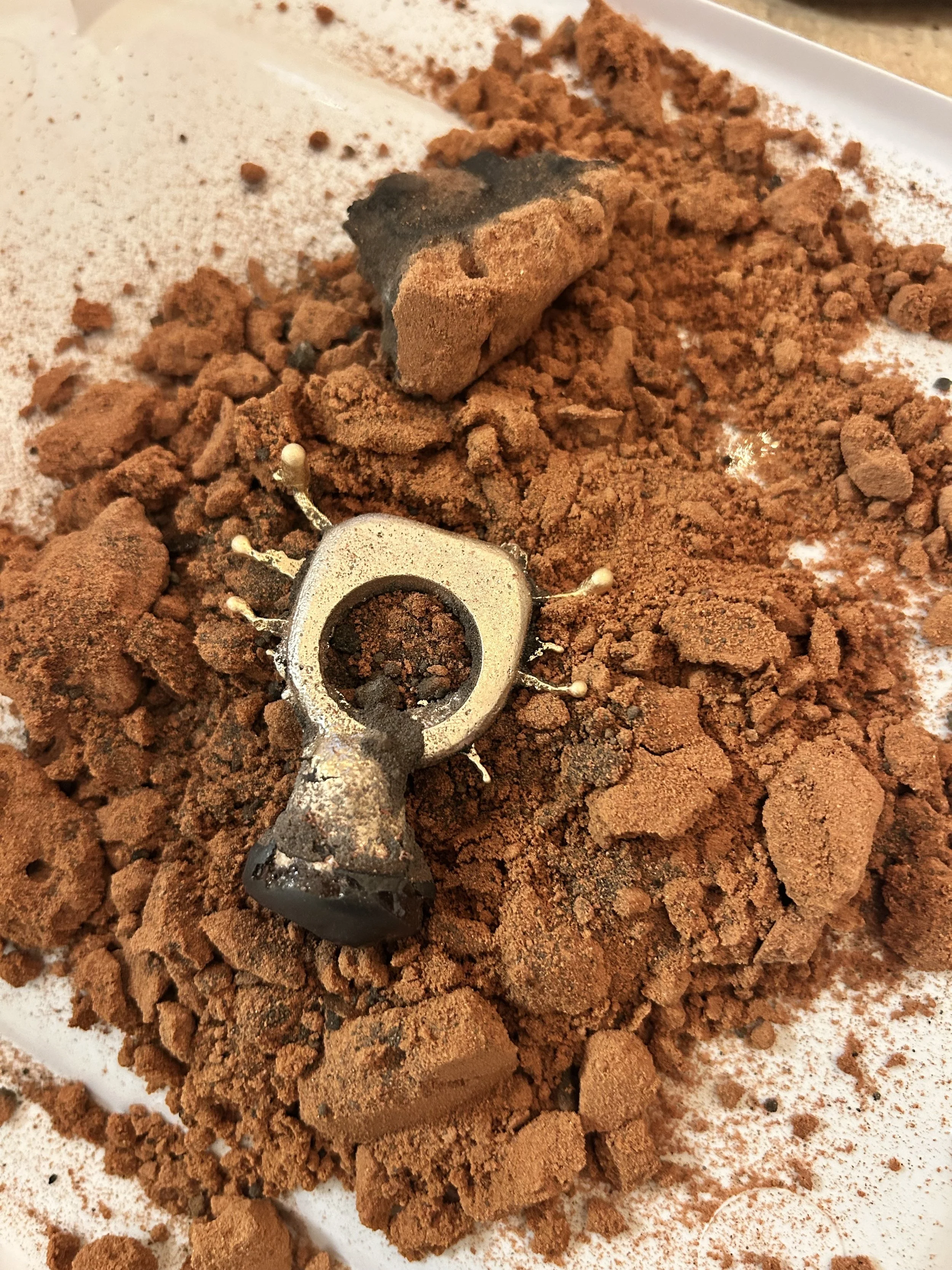 Close-up of a ring surrounded by loose clay. This is a freshly cast ring taken out of it's mold.