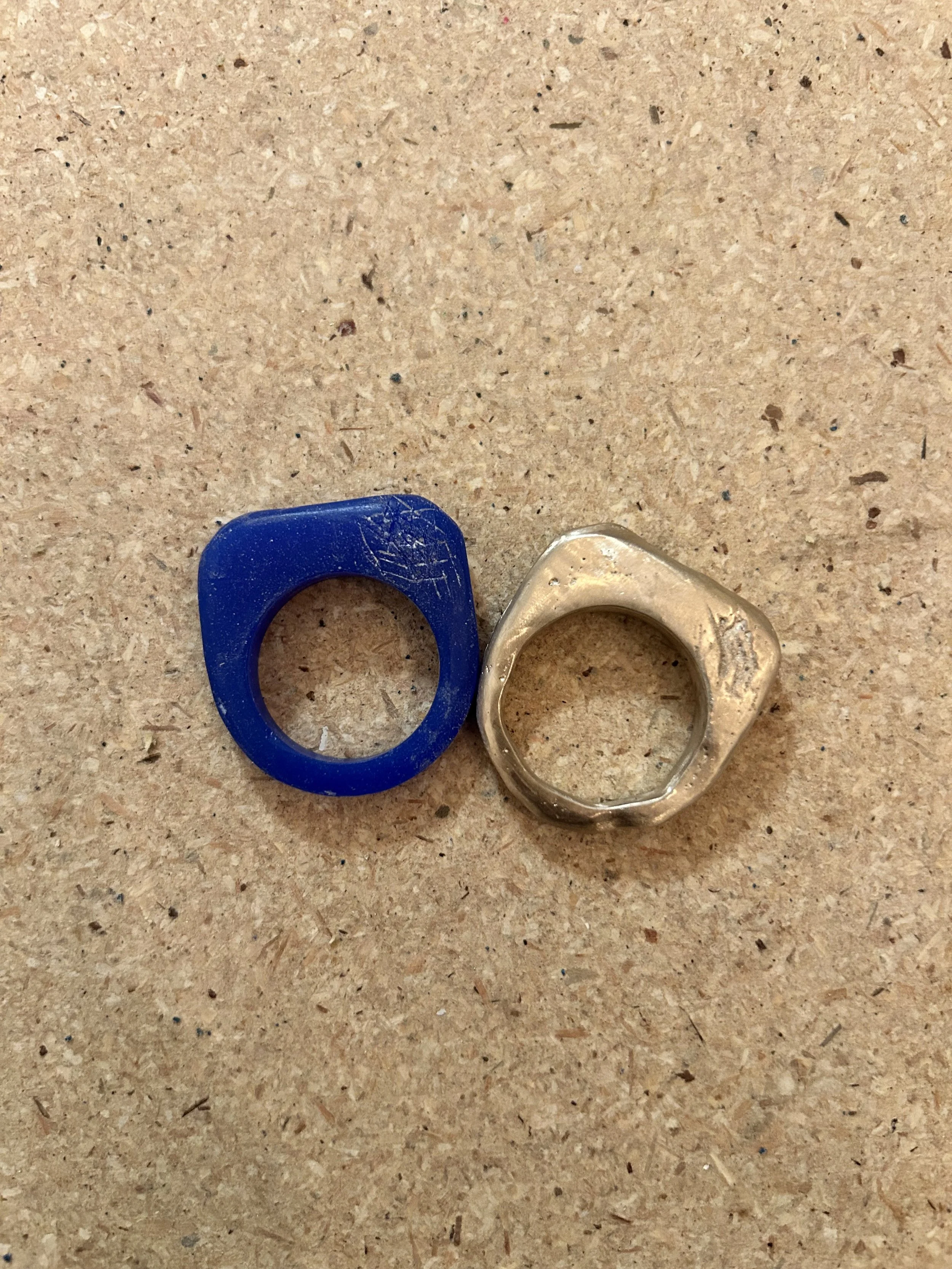 Two rings, one blue and one bronze, resting on a wooden surface. This is the mold and the cast side by side.