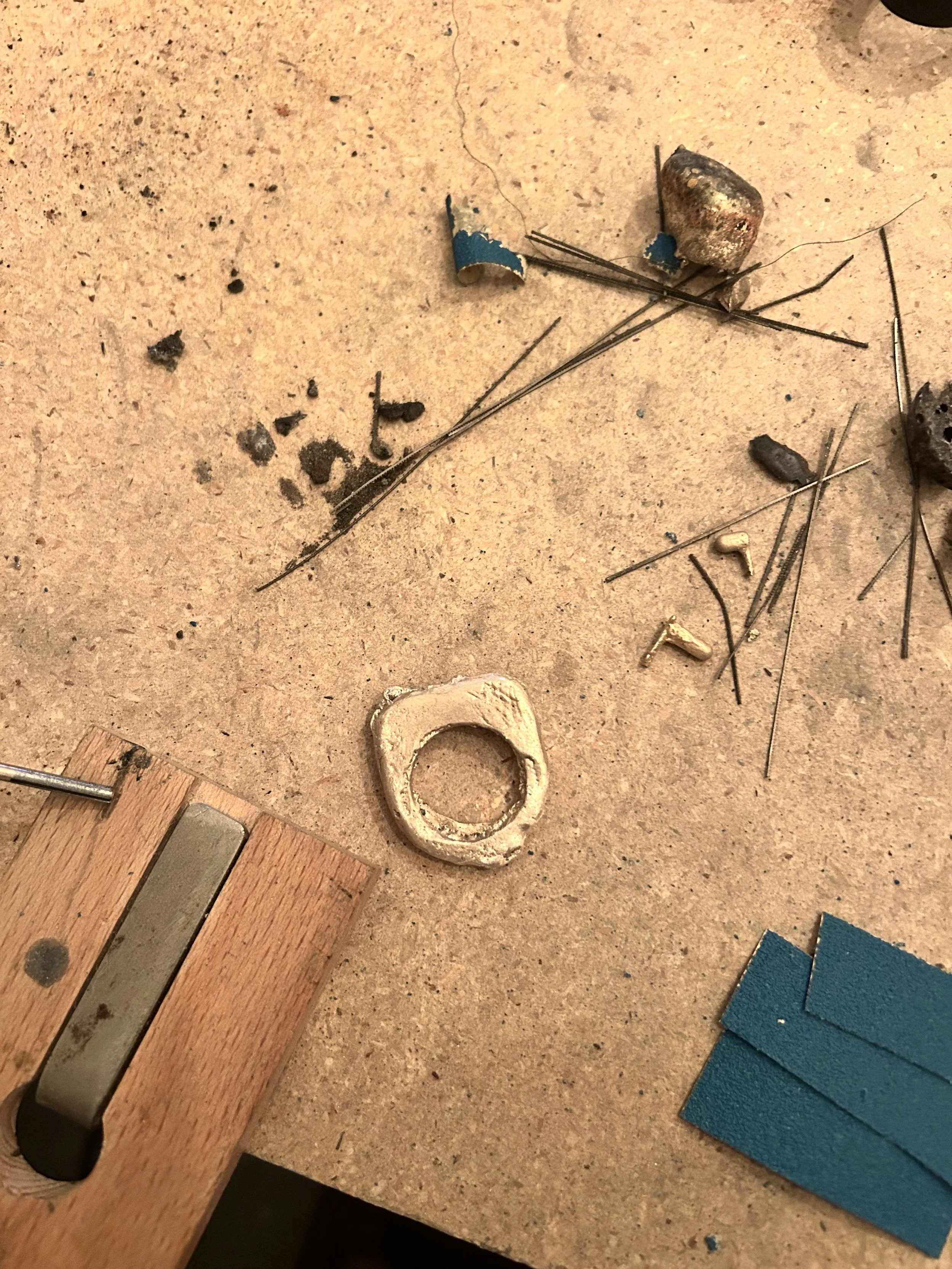Close-up of a dirty workbench surface with various small objects, including a ring, saws, sand paper... all materials used to clean up a freshly cast ring.