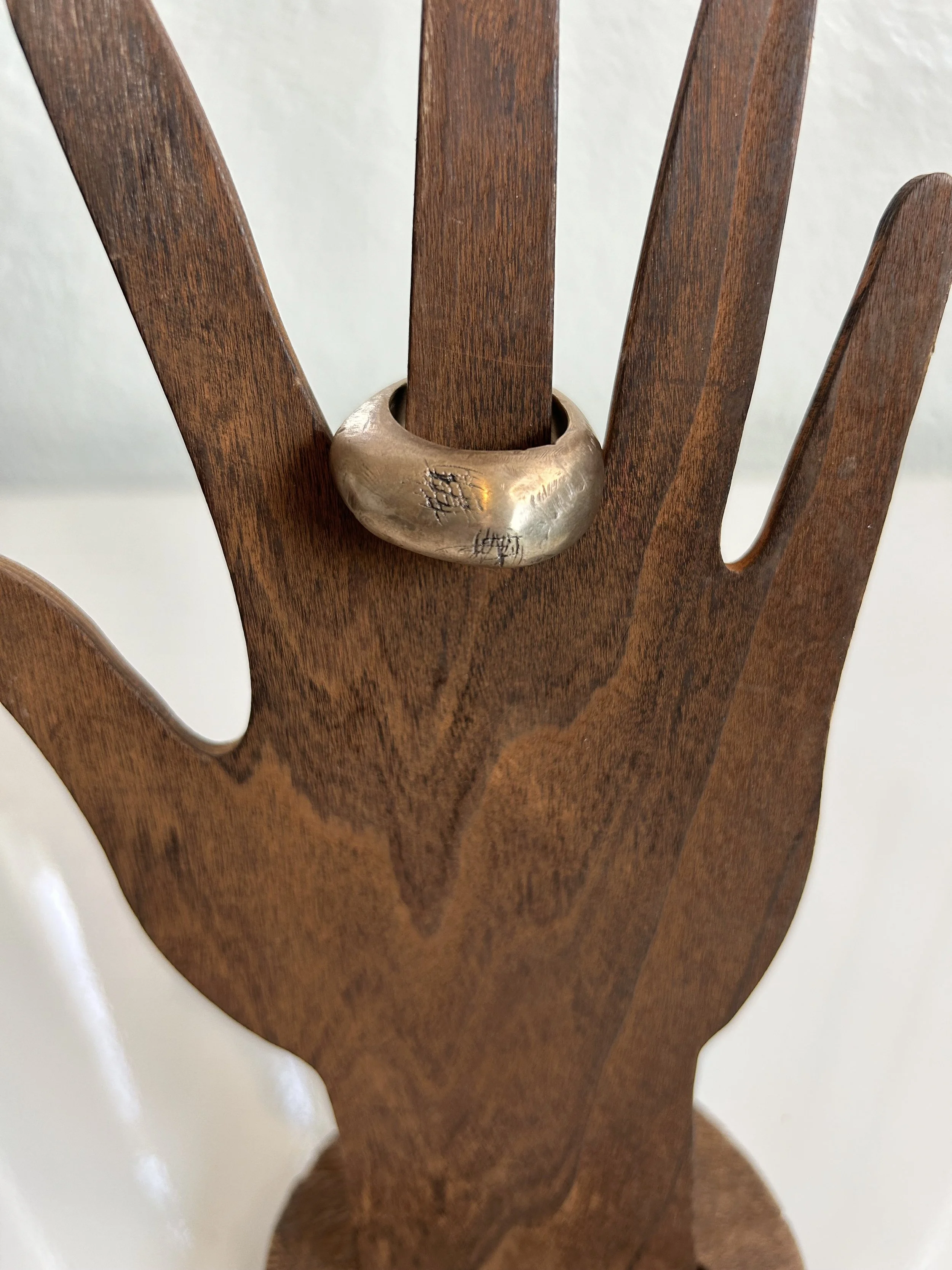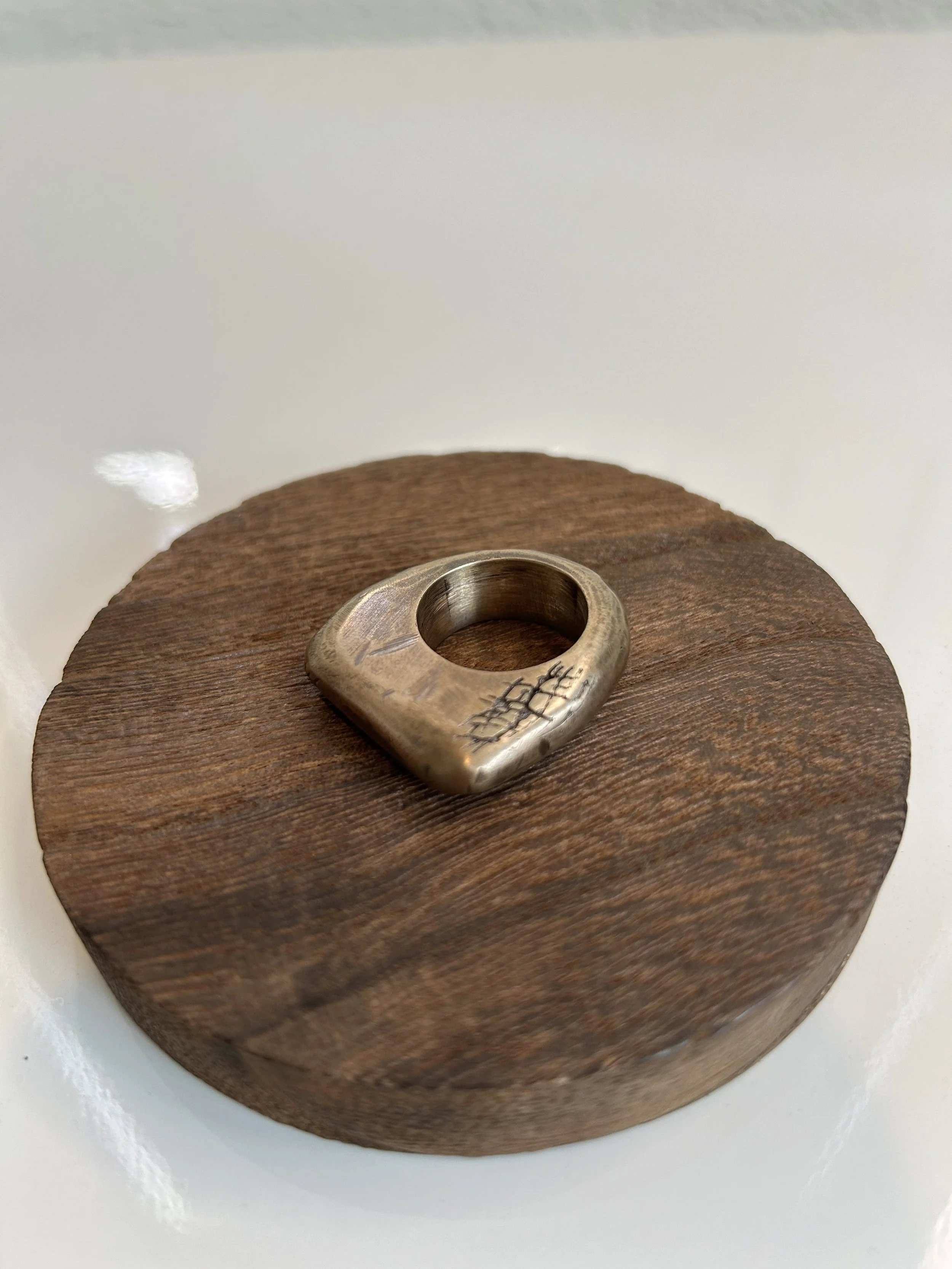 Bronze with a black patina to highlight the rings unique features and intentional markings.